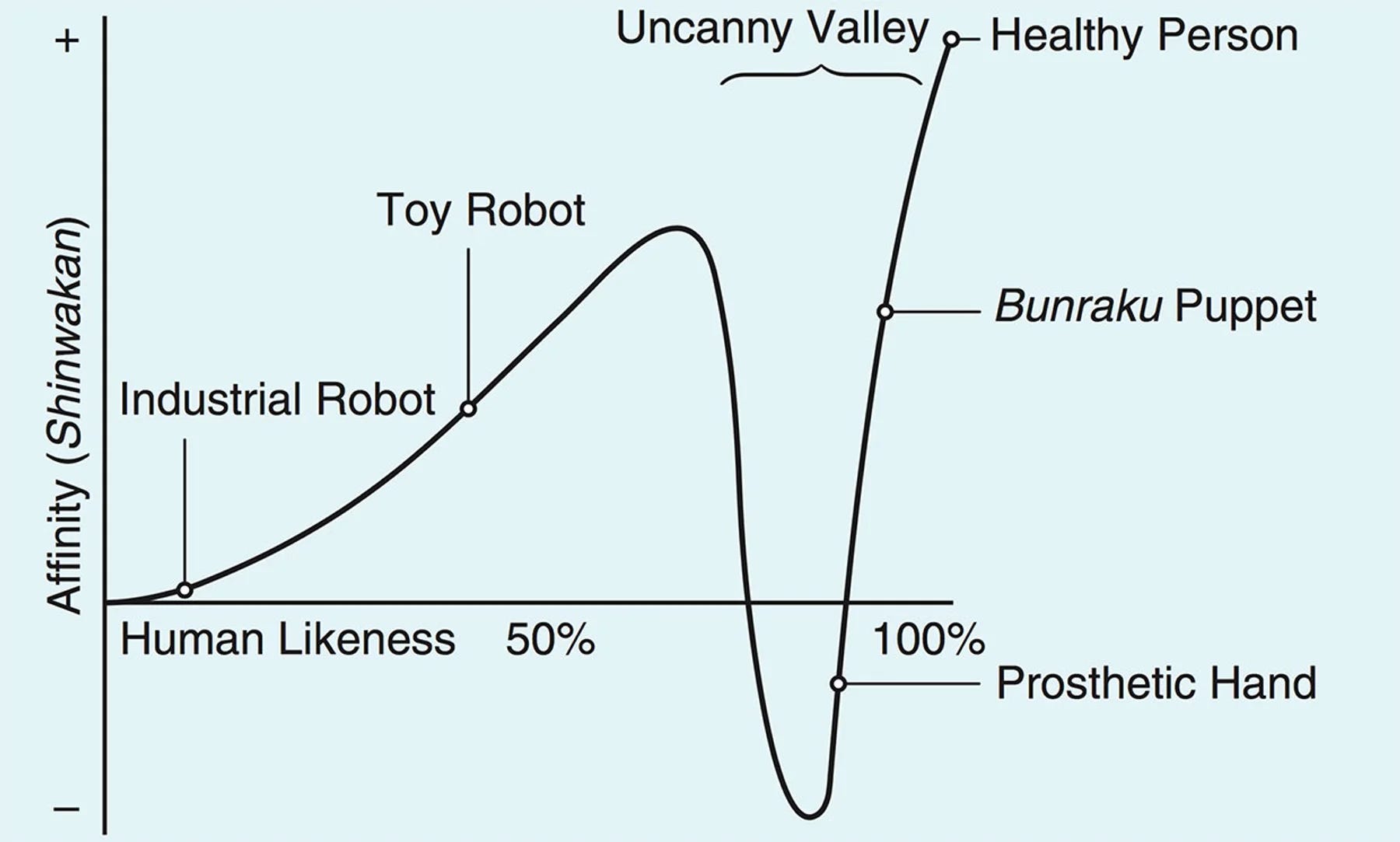 No, I’m not talking about the uncanny valley effect here; it’s the opposite effect, or at least, in the opposite direction. [By the way: You can read the original essay on the uncanny valley by Masahiro Mori, who coined the term in the context of robotics, in its first authorized English translation, here. In meantime, here is a graph from IEEE Spectrum illustrating the phenomenon — and to be clear, the phenomenon hasn’t been tested rigorously; it is more an observation-by-intuition or illustration-by- example:]