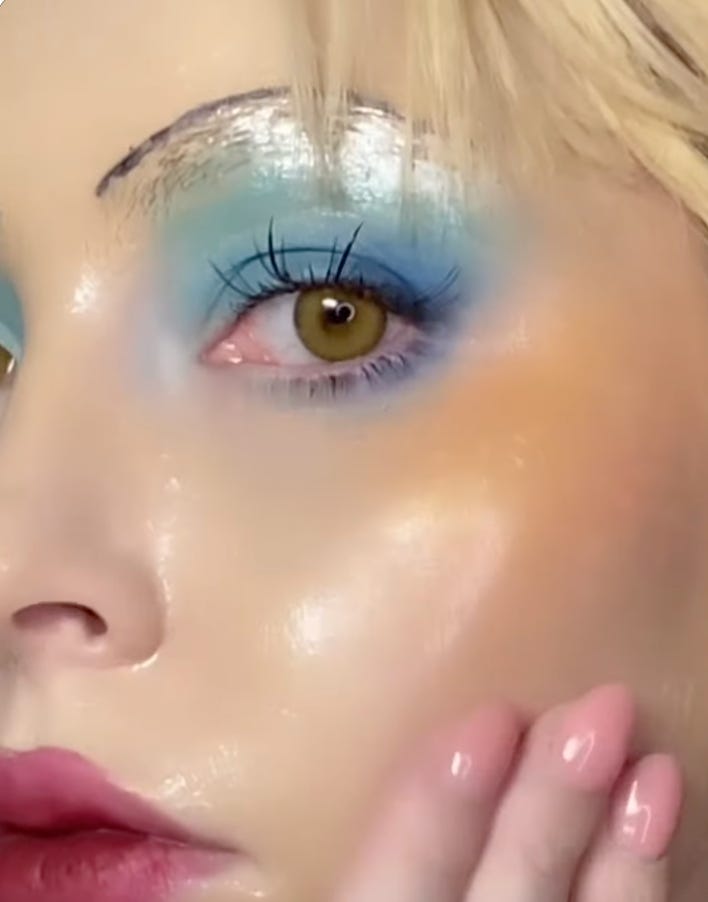Again, this is not AI borrowing human features, but in the other direction: Humans borrowing from AI (more precisely, robotics) — what you’d expect humanoid skin to look like. It’s not quite caricaturing human features, either, like we see with anime. Nor is it fairycore or elfore. It’s simply… glass-like.